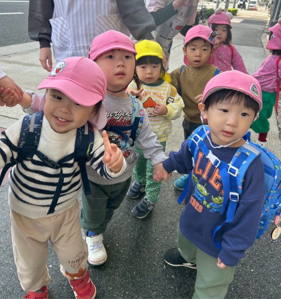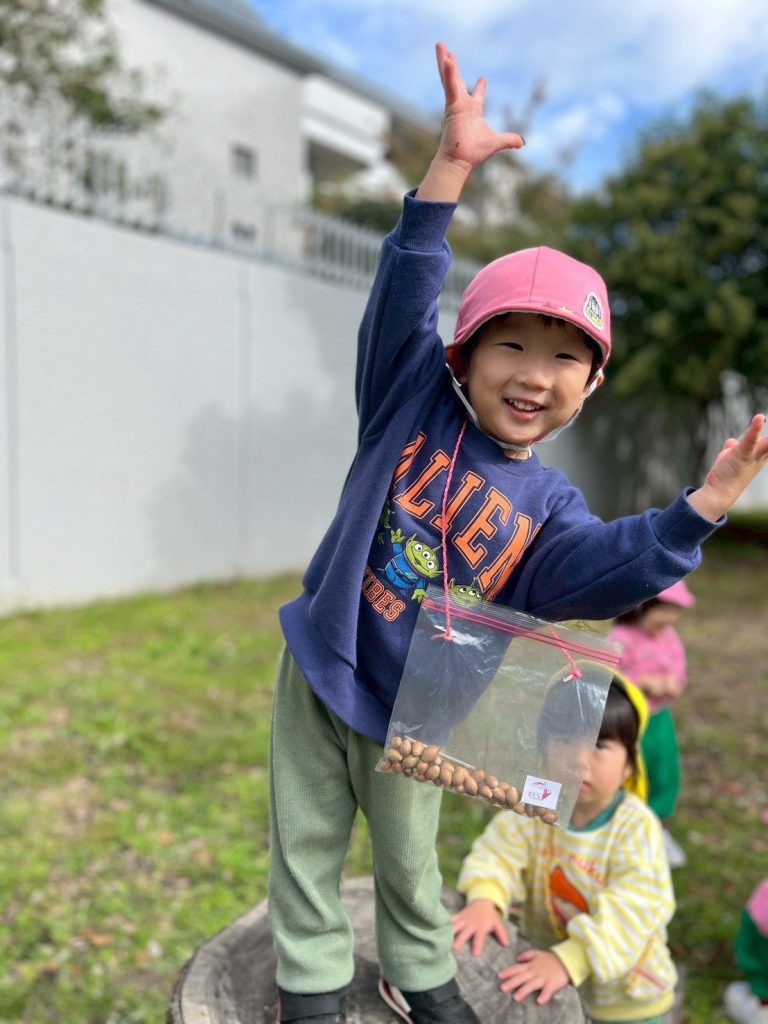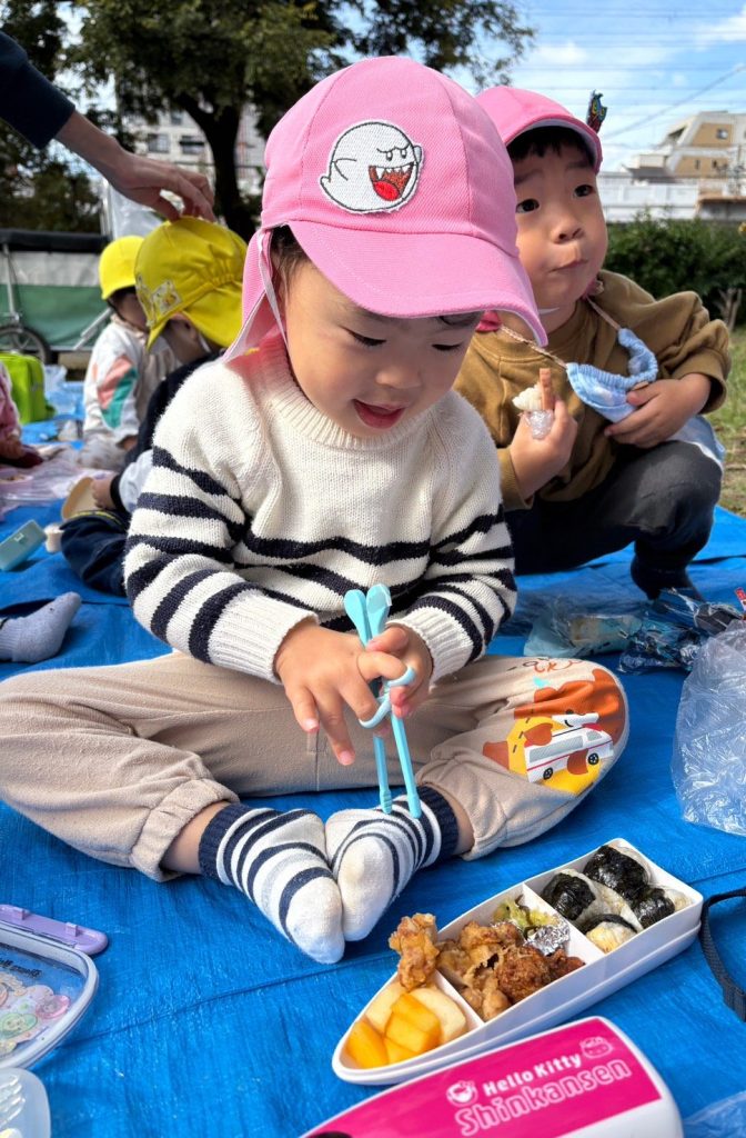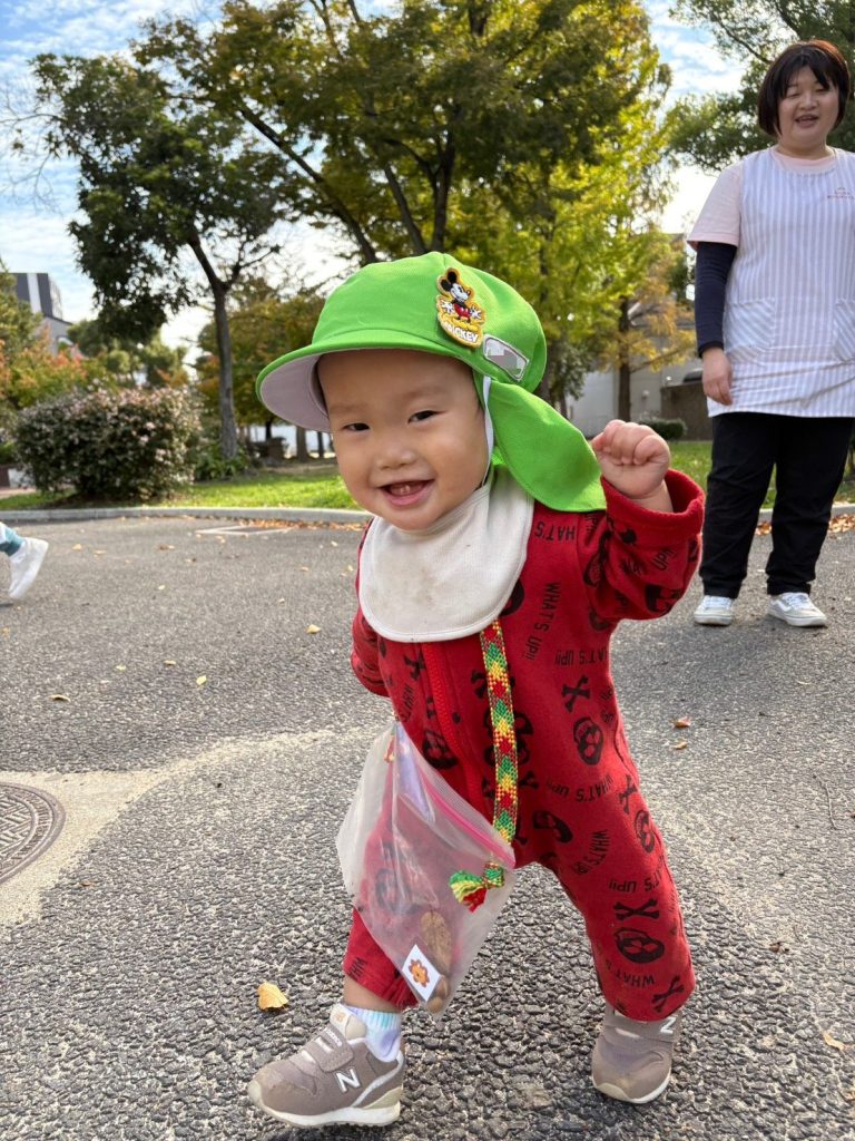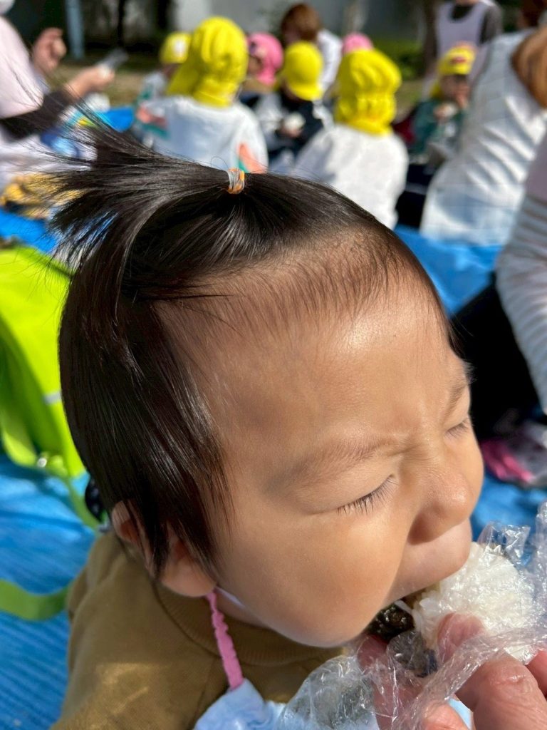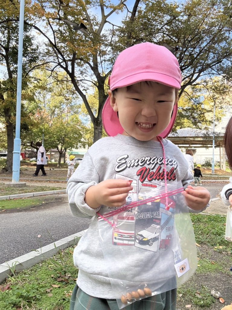 おにぎり遠足♪ 2025 11/11 2025年11月11日 今日は東小橋公園におにぎり遠足に行ってきました(*^-^*) 天気は快晴!遠足日和です♪ 電車になって仲良く歩きましたよ~ どんぐりバッグを身に着けて、どんぐり拾いをしました。 葉っぱ見つけたよ~ お昼ご飯はおにぎりです♪ 美味しい!と笑顔の子どもたちでした(*^-^*) 頬張っていましたよ(^^♪ ブログ